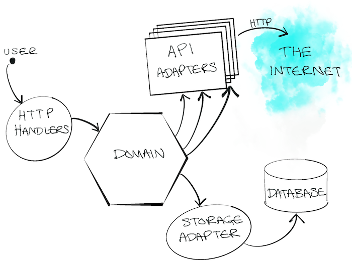 Onze applicatie was gestructureerd in een hexagonale / poorten & adapters-architectuur. Onze domeincode was losgekoppeld van de chaos van de buitenwereld waarmee we te maken hadden. Onze "adapters" waren in feite Go-clients die de aanroep van de verschillende API's inkapselden.