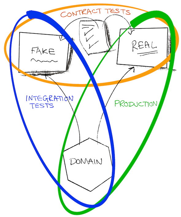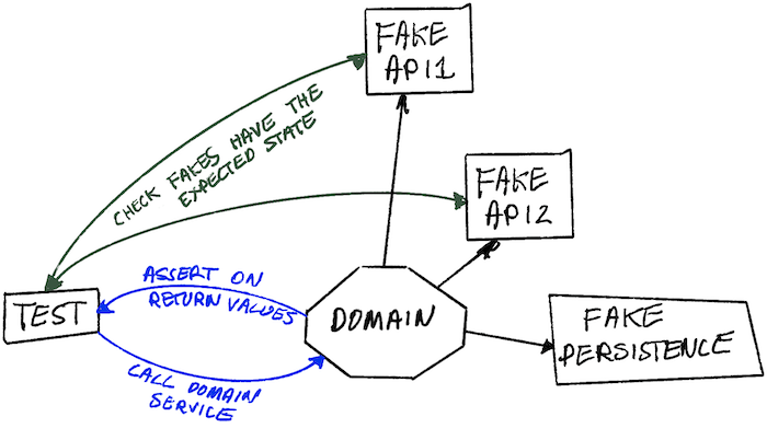We moesten fakes gebruiken. Door onze afhankelijkheden te modelleren als stateful API's met in-memory fakes, konden we integratietests schrijven met een veel bredere scope, waardoor we konden testen of echte use cases werkten, wederom zonder het hele systeem te hoeven opstarten, en in plaats daarvan bijna dezelfde snelheid hadden als unittests.